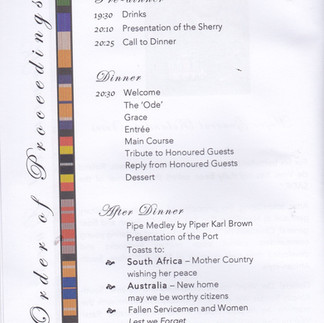 The Formal Mess evening began for the 72 guests with Drinks at 1930H at the downstairs reception. Mike Black, the Mess President presented the South African Sherry before the call to dinner was made by the Mess Vice President, Brent van de Stadt. The Guest of Honour and guests were piped into the mess area by our piper, Karl Brown.