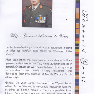 Veteran Andre van der Berg - In recognition of his dedication to duty and to the ideals of SAMVOA. As Events Coordinator and a Formal Mess Committee member, Andre has excelled in improving contact with and between Victorian members and, in so doing, he has ensured that the Victoria leader-group receives exceptional support in achieving their objectives.