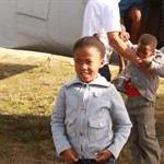 Kinders wag gretig om op die vliegtuig te klim.